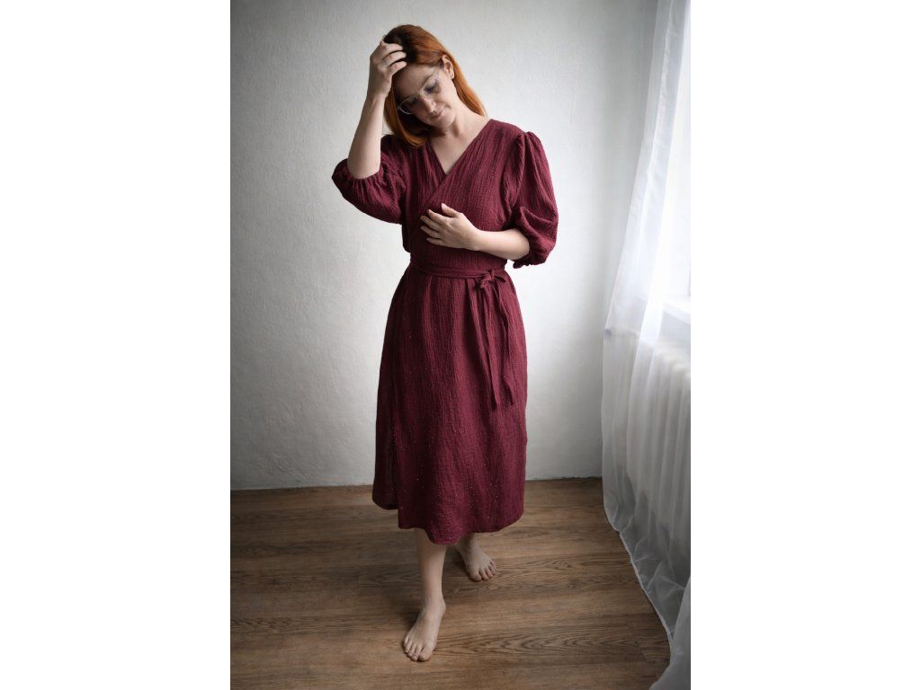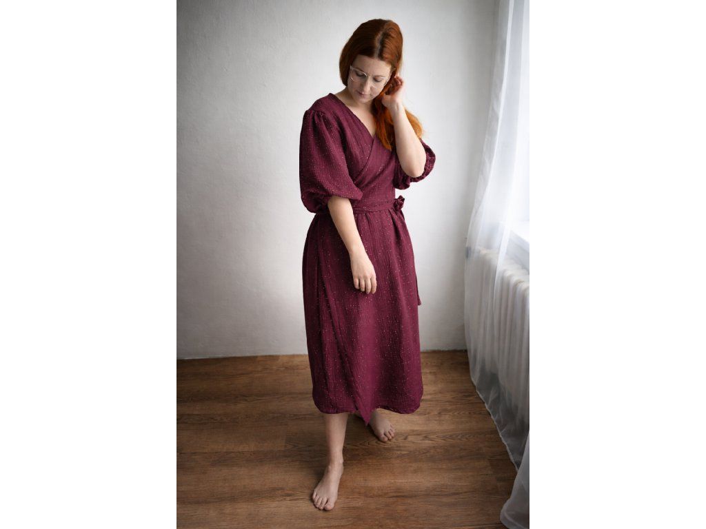 Šité v midi délce s nabíranými rukávy, ty jsou zakončeny gumičkou.